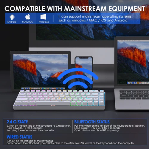Tastiera E-Yooso Z-686 Tri-Mode White është zgjedhja ideale për ata që kërkojnë kompaktësi, shpejtësi dhe fleksibilitet në një pajisje unike.